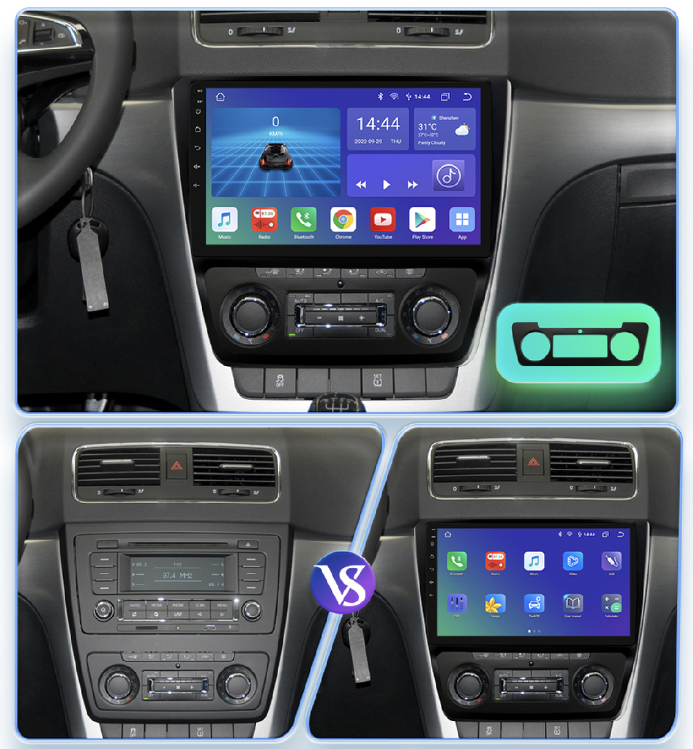 Rychlý systém Android 13 nabízí bezdrátové zrcadlení pro snadné propojení s Android i iPhone. Díky Apple CarPlay a Android Auto máte rychlý přístup k funkcím telefonu. Bluetooth umožňuje příjem hovorů a přehrávání hudby přímo z telefonu. Rádio lze připojit k Wi-Fi nebo vložit SIM kartu (pouze u některých výkonnostních verzí) pro připojení k internetu. Integrovaná navigace IGO Primo funguje bez internetu a rádio podporuje tlačítka na volantu i parkovací senzory. K dispozici je také možnost připojení parkovací kamery (CINCH). Rádio se automaticky vypne po vytažení klíče, aby nevybíjelo baterii.