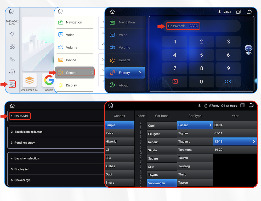 Pro komunikaci s vozidlem je potřeba nastavit model vozidla ve factory settings.