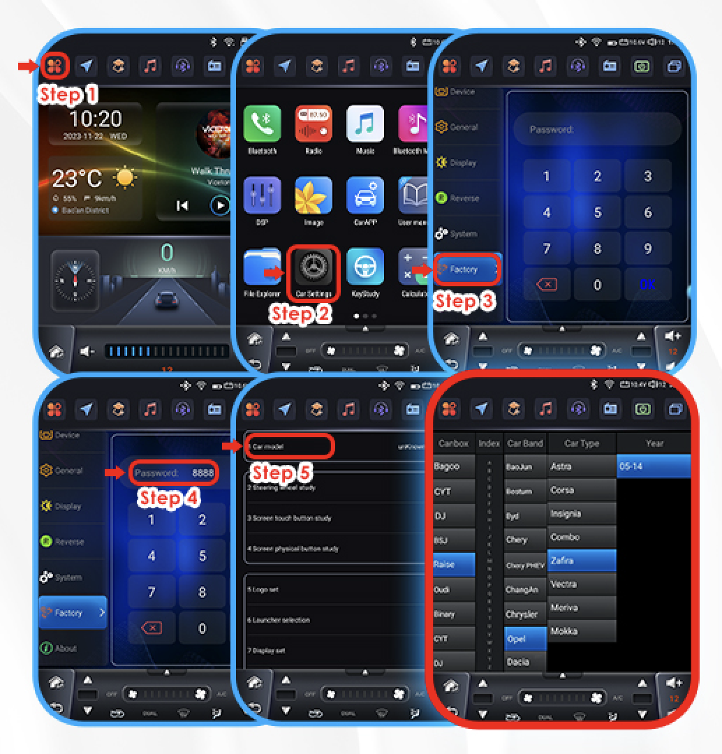 Pro komunikaci autorádia s vozidlem je nutné nastavit model vozidla podle obrázku.