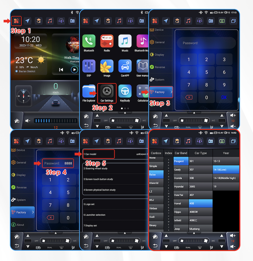 Pro komunikaci autorádia s vozidlem je nutné nastavit model vozidla podle obrázku
