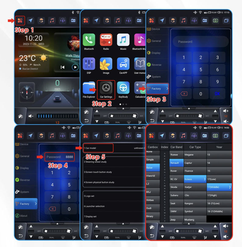Pro komunikaci autorádia s vozidlem je nutné nastavit model vozidla podle obrázku
