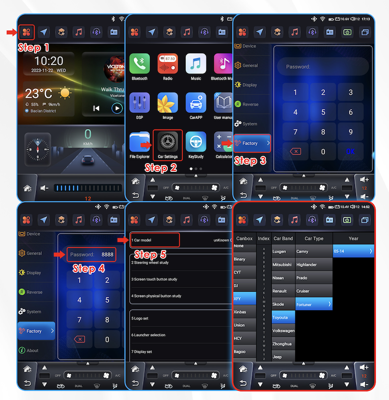 Pro správnou funkci ovládacích prvků, tlačítek na volantu a komunikaci s vozidlem je nutné po instalaci rádia nastavit model vozidla.