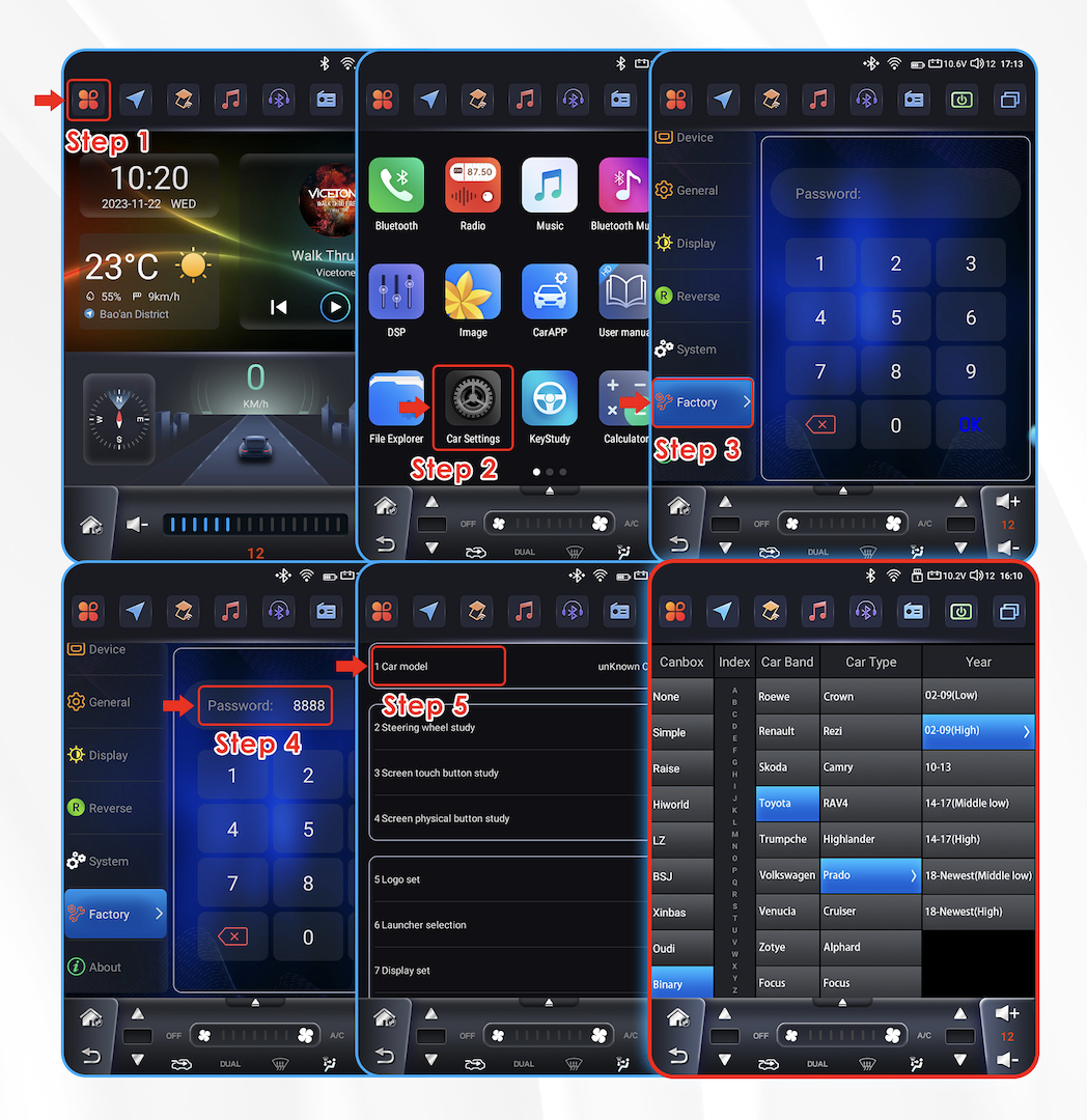 Pro komunikaci autorádia s vozidlem je nutné nastavit model vozidla podle obrázku.