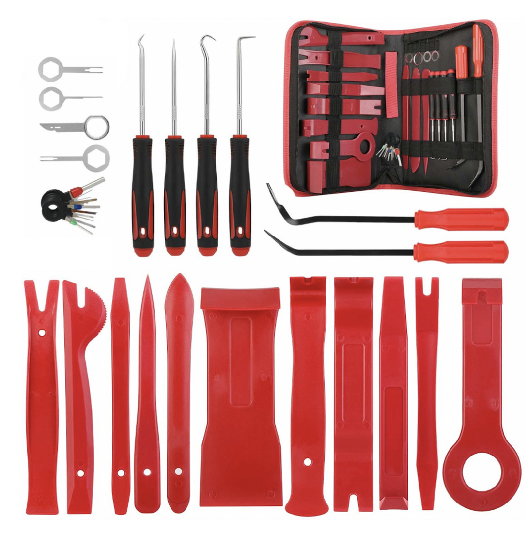 Celkově je 31dílná sada nástrojů pro demontáž plastového obložení a přístrojové desky a uvolňovací klíče cennou sadou pro každého, kdo pracuje na autech nebo chce provádět opravy. Se správnými nástroji lze demontáž a instalaci vnitřních a vnějších součástí provést rychle a snadno, aniž by došlo k poškození vozu.