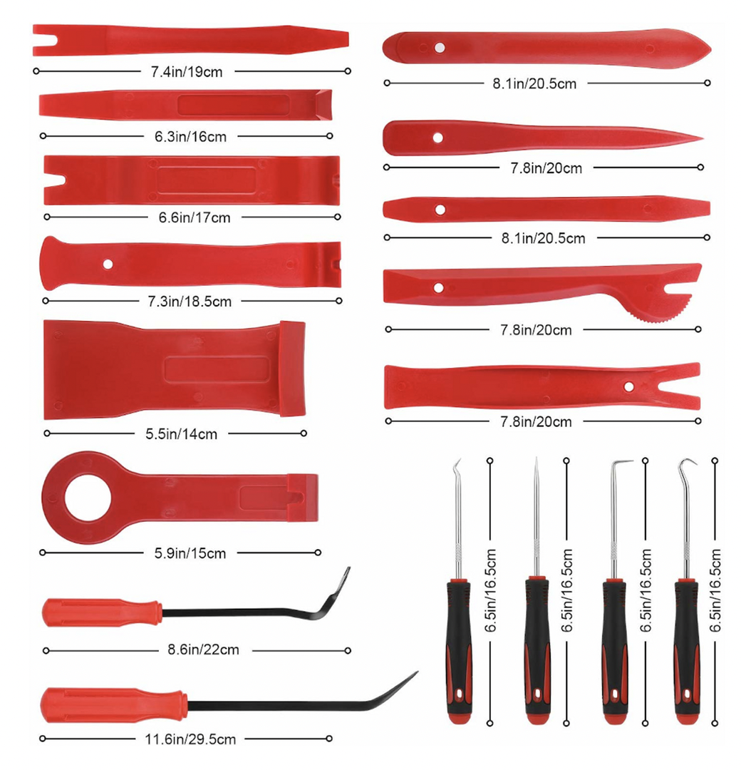 S touto fantastickou automobilovou zaklapávací sadou obložení a lišty můžete snadno odstranit obložení, lišty, dveřní panely a palubní desky. Robustní, odolná plastová konstrukce zabraňuje poškození a také funguje skvěle při opravách nábytku měkkého a tvrdého dřeva, restaurování starožitností, čalounění, kožených pracích atd. Funguje na vnitřních a vnějších lištách, odstraňovač širokých hran, odstraňovač úzkých hran, tahový odstraňovač, odstraňovač rukojetí a odstraňovač spony na čalounění.