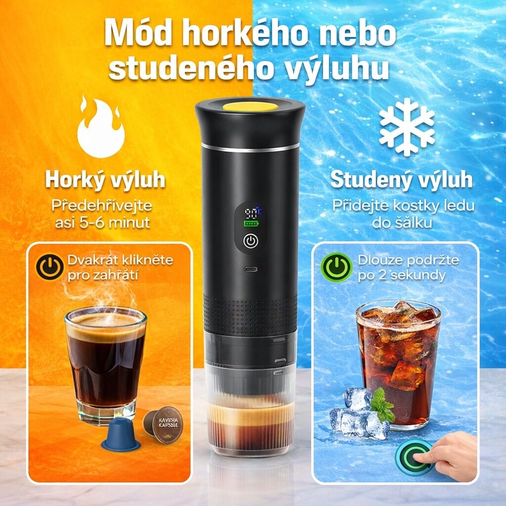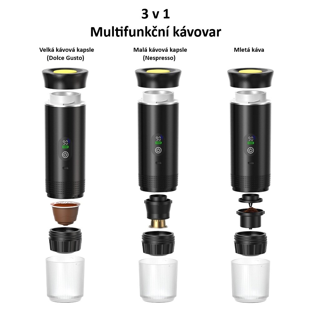 Přenosný espresso kávovar 3v1, dokonalé espresso kdykoliv a kdekoliv.