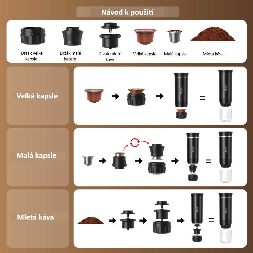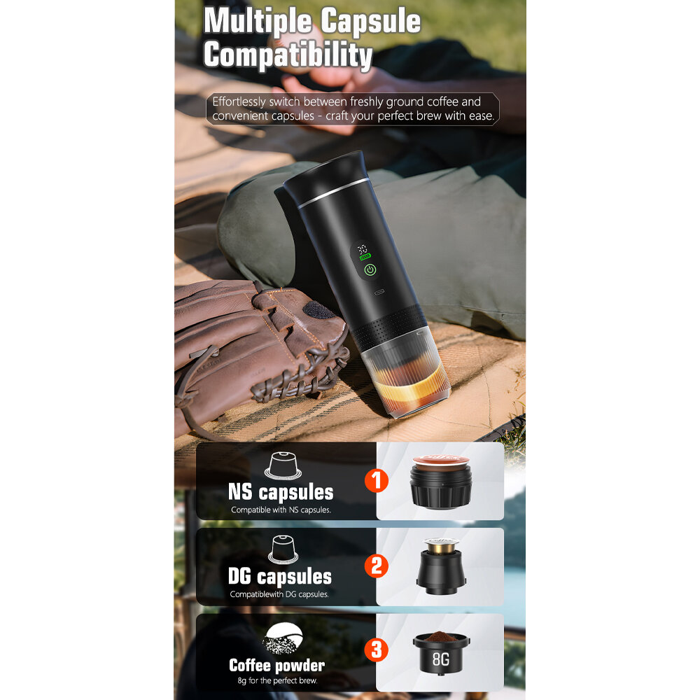 Milujete kvalitní kávu i mimo domov? Tento kompaktní a výkonný přenosný kávovar vám umožní vychutnat si plnohodnotné espresso na cestách, v kanceláři, při kempování i doma. Díky kompatibilitě s kapslemi Nespresso®, Dolce Gusto® i mletou kávou nabízí maximální flexibilitu a jednoduché použití.