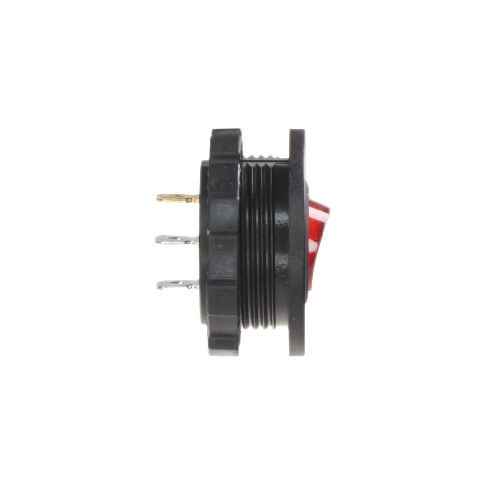 Spínač kolébkový kulatý 20A červený s podsvícením. Spíná kladné napětí mezi kontakty 1 a 2, na kontaktu 3 je kostra pro podsvícení.
