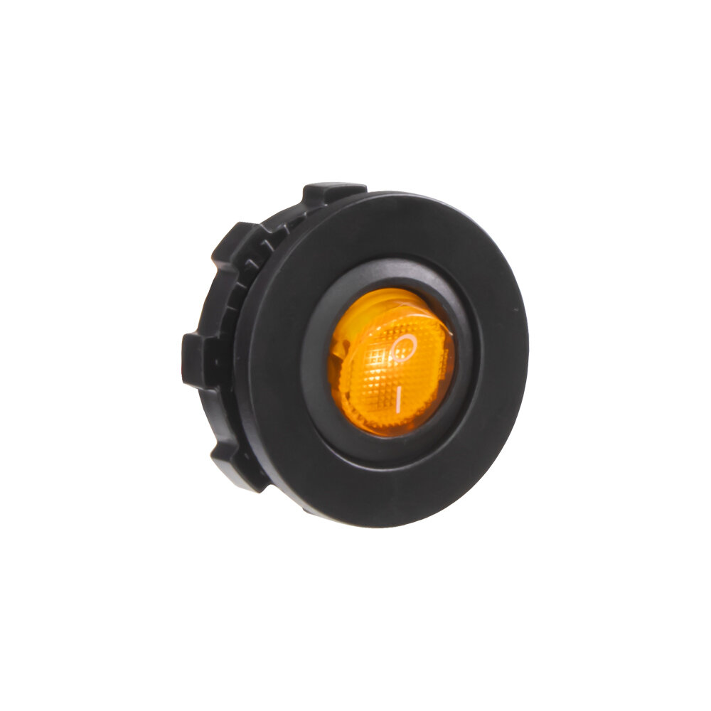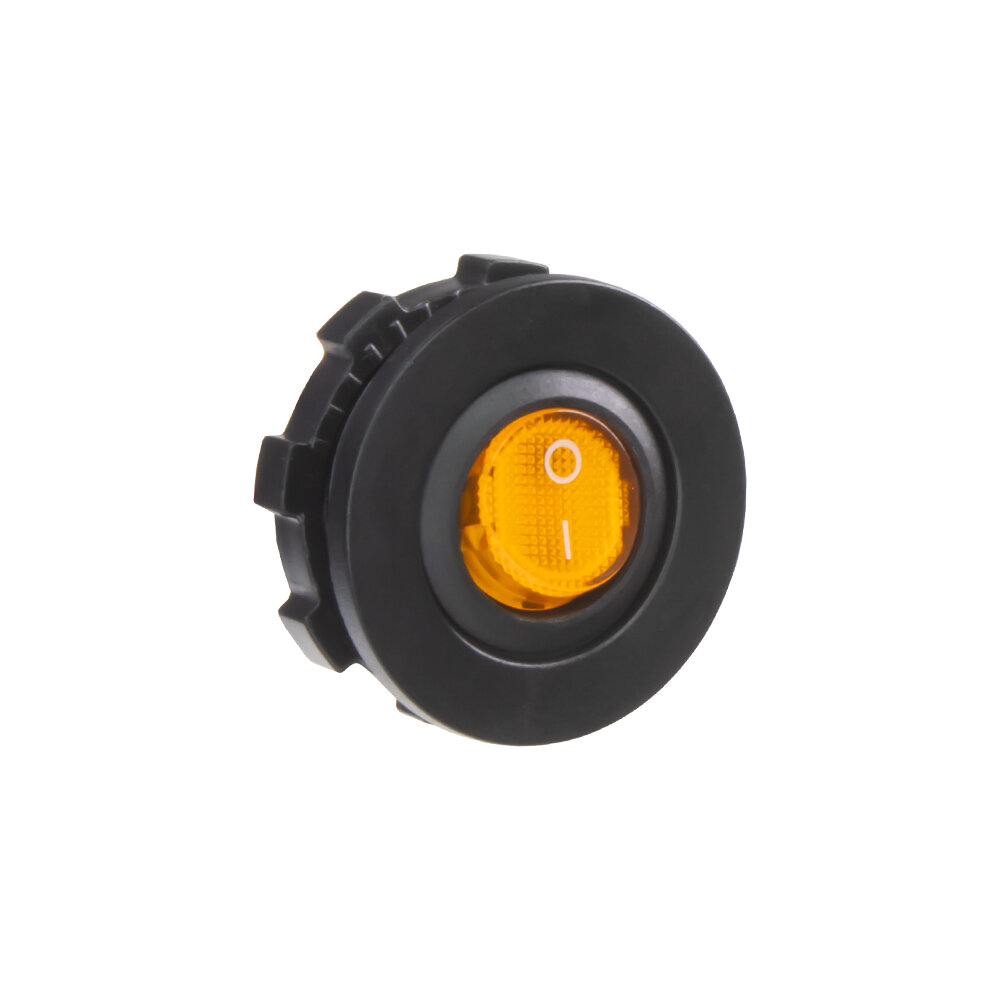 Spínač kolébkový kulatý 20A oranžový s podsvícením. Spíná kladné napětí mezi kontakty 1 a 2, na kontaktu 3 je kostra pro podsvícení.