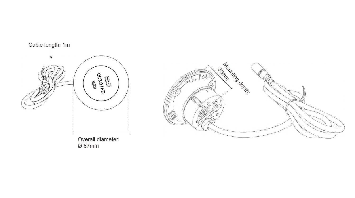USB nabíječka do nábytku, 1x QC3.0 + USB-C.