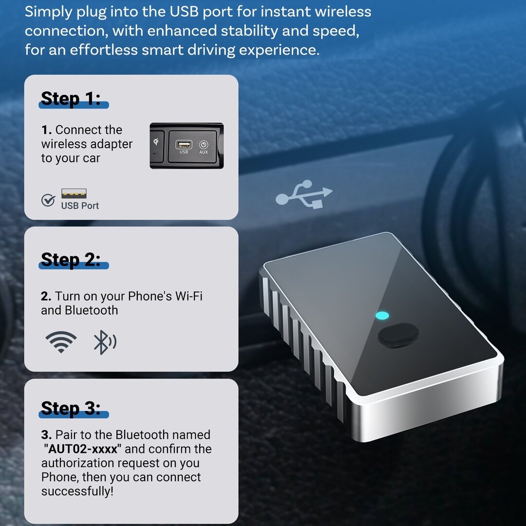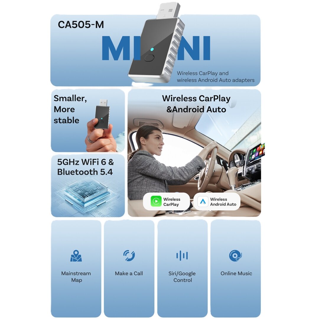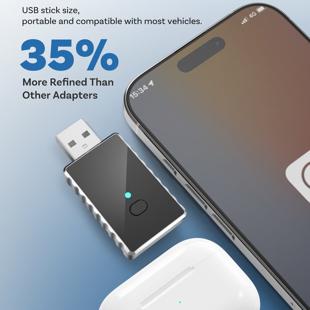 S miniaturním modulem CA505 není více třeba připojovat telefon do USB vozidla. Připojení s Apple CarPlay / AndroidAuto jednotkou vozidla proběhne automaticky přes WiFi, vždy po zapnutí zapalování. Modul zůstává trvale připojen do USB jednotky vozidla namísto telefonu a Vy si můžete užívat svobody bez kabelu.
