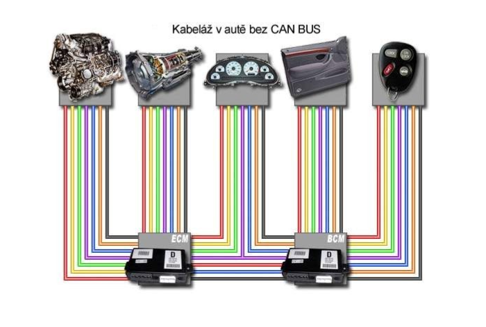 - Centralizace signálů — místo stovek samostatných vodičů teče většina informací jednou sběrnicí.